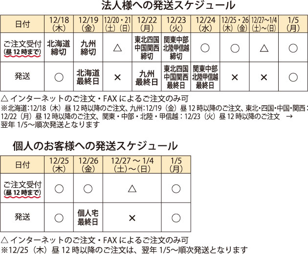 尚、法人様向けの配送は発送地域によって最終受付日が異なりますのでご注意ください。