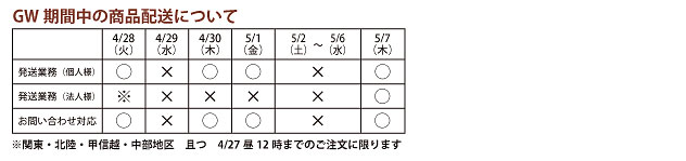 ②法人様 … 関東・北陸・甲信越・中部地区は4/27昼12時までのご注文に限り、4/28に発送させていただきます。その他の地区および4/27昼12時以降のご注文は、5/7より順次発送させていただきます。何とぞご了承ください。