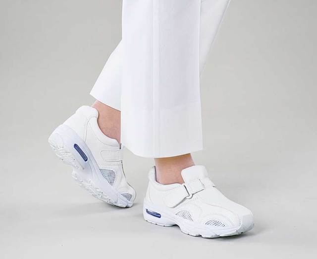 ●カラー/ホワイト ●素材/甲皮:合成レザー・ナイロンメッシュ、中敷:カップインソール(衝撃吸収材付)、底材:EVAスポンジ・導電合成ゴム(エアークッション内蔵) ●ウイズ/3E ●かかと高さ/約40mm ●重さ/片足約240g ◎26.5cm以上はメンズページにてご案内しております。